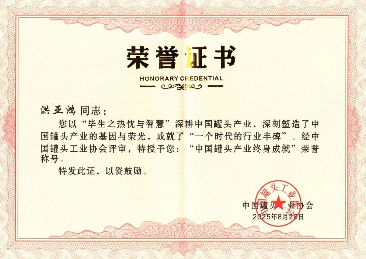 洪亞鴻憑借對行業(yè)的十年如一日的堅守耕耘、卓越貢獻(xiàn),被協(xié)會授予“中國罐頭產(chǎn)業(yè)終身成就”與“中國罐頭產(chǎn)業(yè)堅守者”兩項榮譽(yù)稱號。