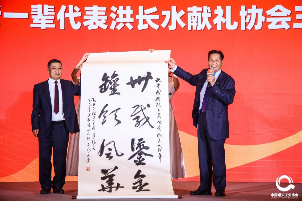墨韻流芳,丹青寄情。洪長水董事長作為行業(yè)老一輩代表現(xiàn)場贈送墨寶一卷“卅載鎏金 罐領(lǐng)風(fēng)華”,以此獻(xiàn)禮中國罐頭工業(yè)協(xié)會三十華誕,表達(dá)對行業(yè)未來的美好祝愿。
